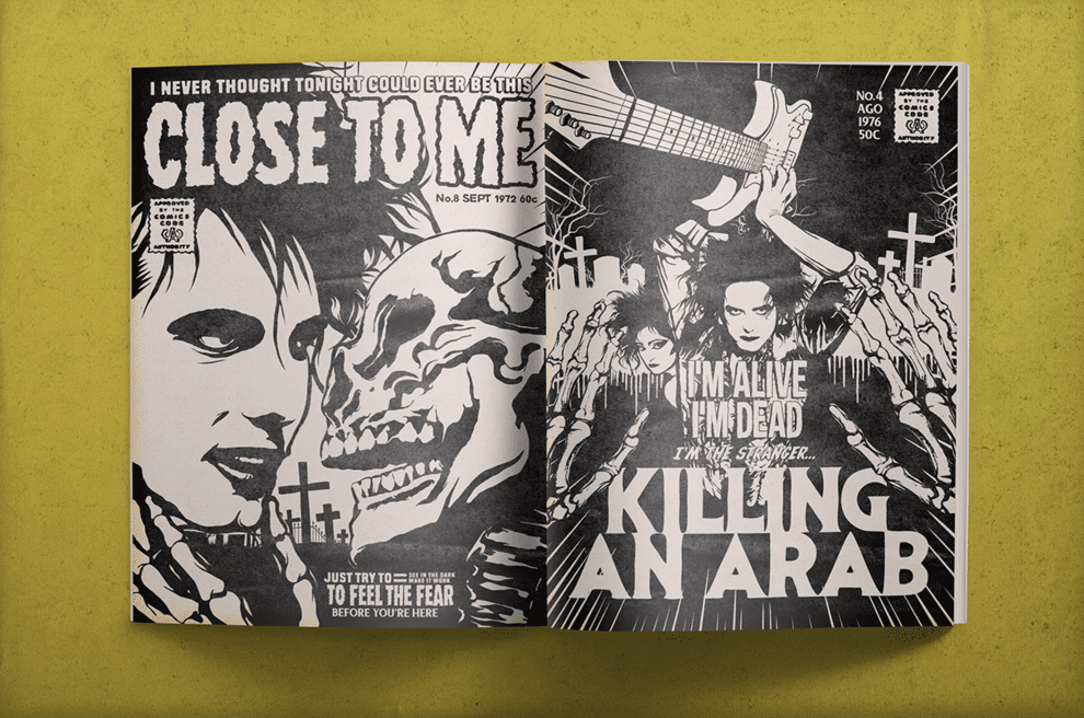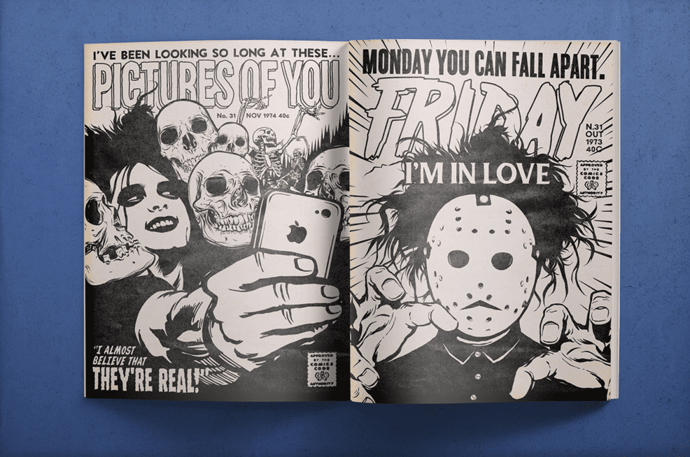 Durante esse crossover de estilos, a temática dos filmes de terror é somada aos dois universos. Assim, Jason, Evil Dead e The Return Of The Living Dead não poderiam mesmo ficar de fora no imaginativo mundo macabro de Robert Smith.