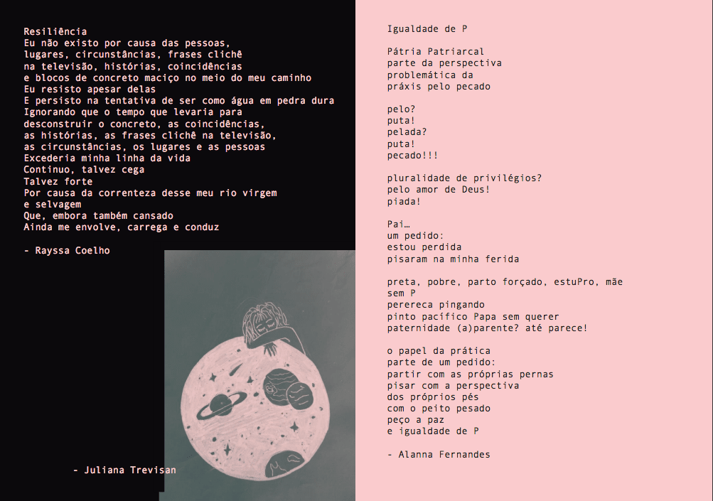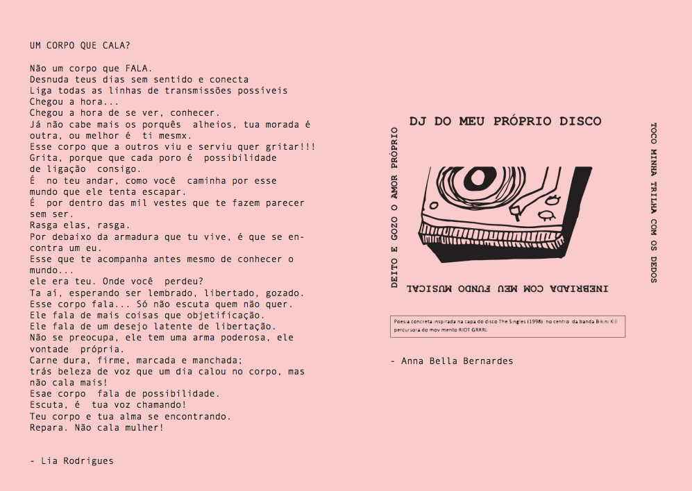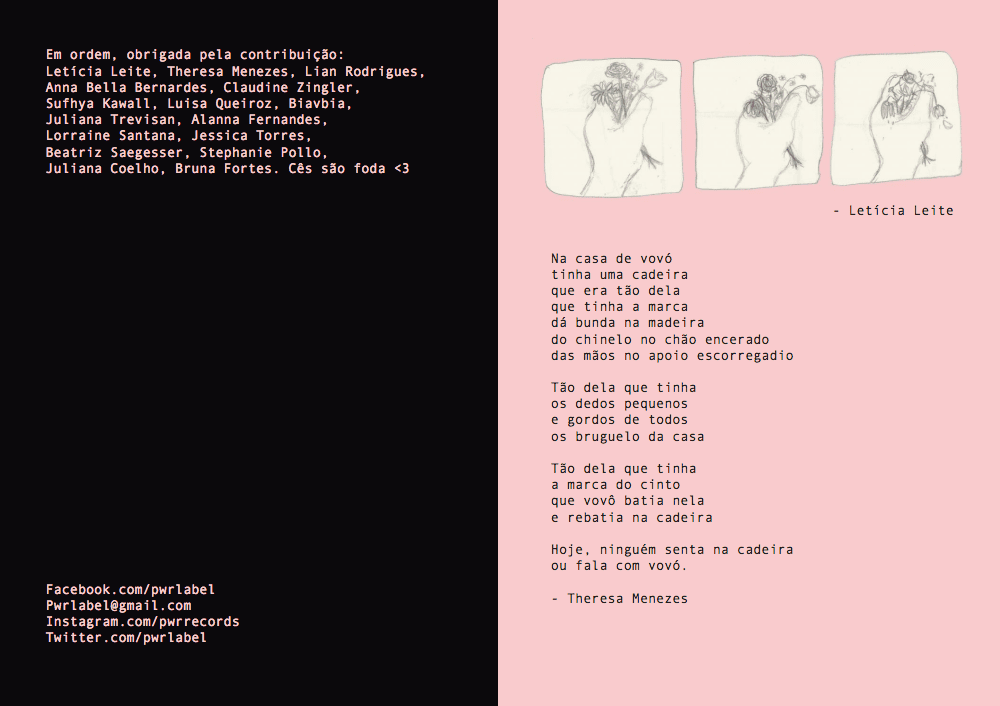 Letícia Tomás: “Upei uma versão digital da zine, que acabou ficando bem diferente da física, mas dá pra ver o trabalho de todo mundo direitinho. Então, a PWR tem uma grande carga pessoal pra mim, me dá oportunidade de fazer uma série de coisas que sempre tive vontade porém nunca desenvolvi, uma zine colaborativa é uma dessas coisas, jurava que ninguém ia querer saber, mas só fiz uma convocatória das redes com um prazo de sei lá 4 dias, e receberemos uns 20 e-mails.